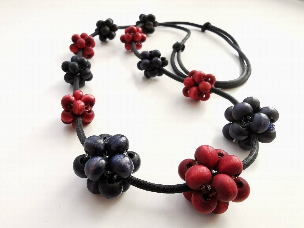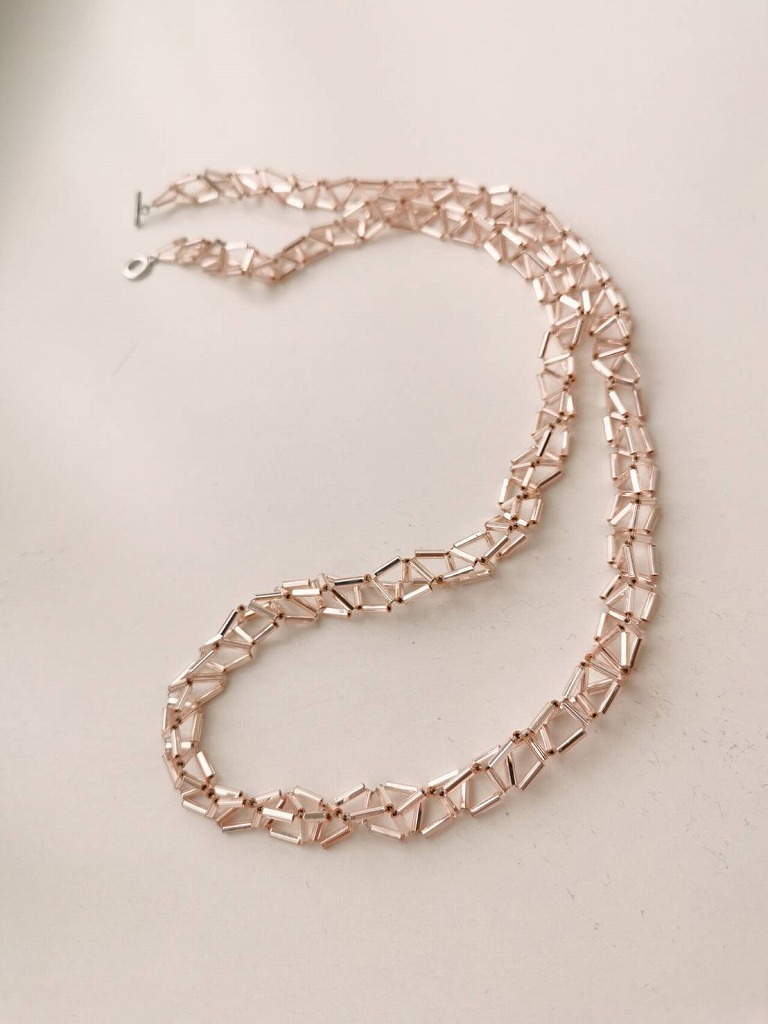 ガラス製の、竹のように細長いビューグルビーズを編んだネックレスなどが並びます。