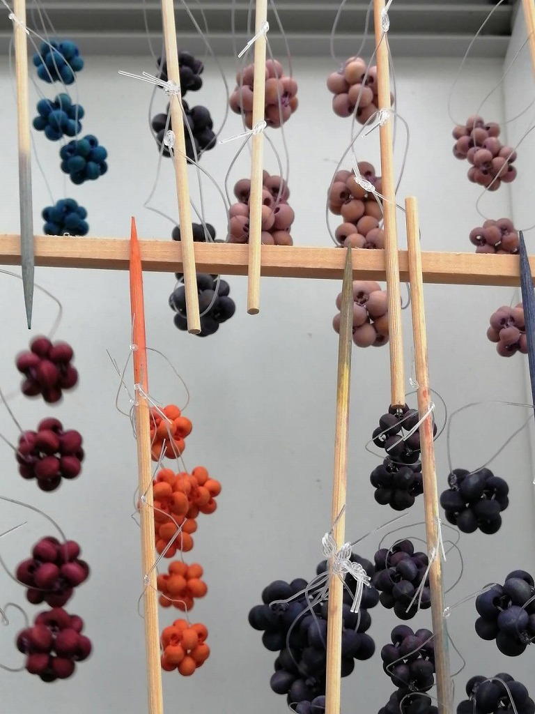 ウッドビーズを編んでから「みや古染め」で染め上げたり、