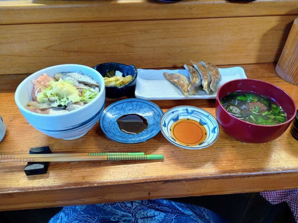 注文した「いわしランチ」は、いわし丼に、いわしのつみれ汁、いわし餃子におしんこが付いて1300円!