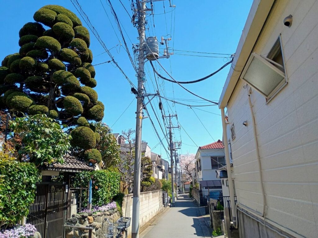 立派な庭木がそびえ、電柱もまだ続いています。